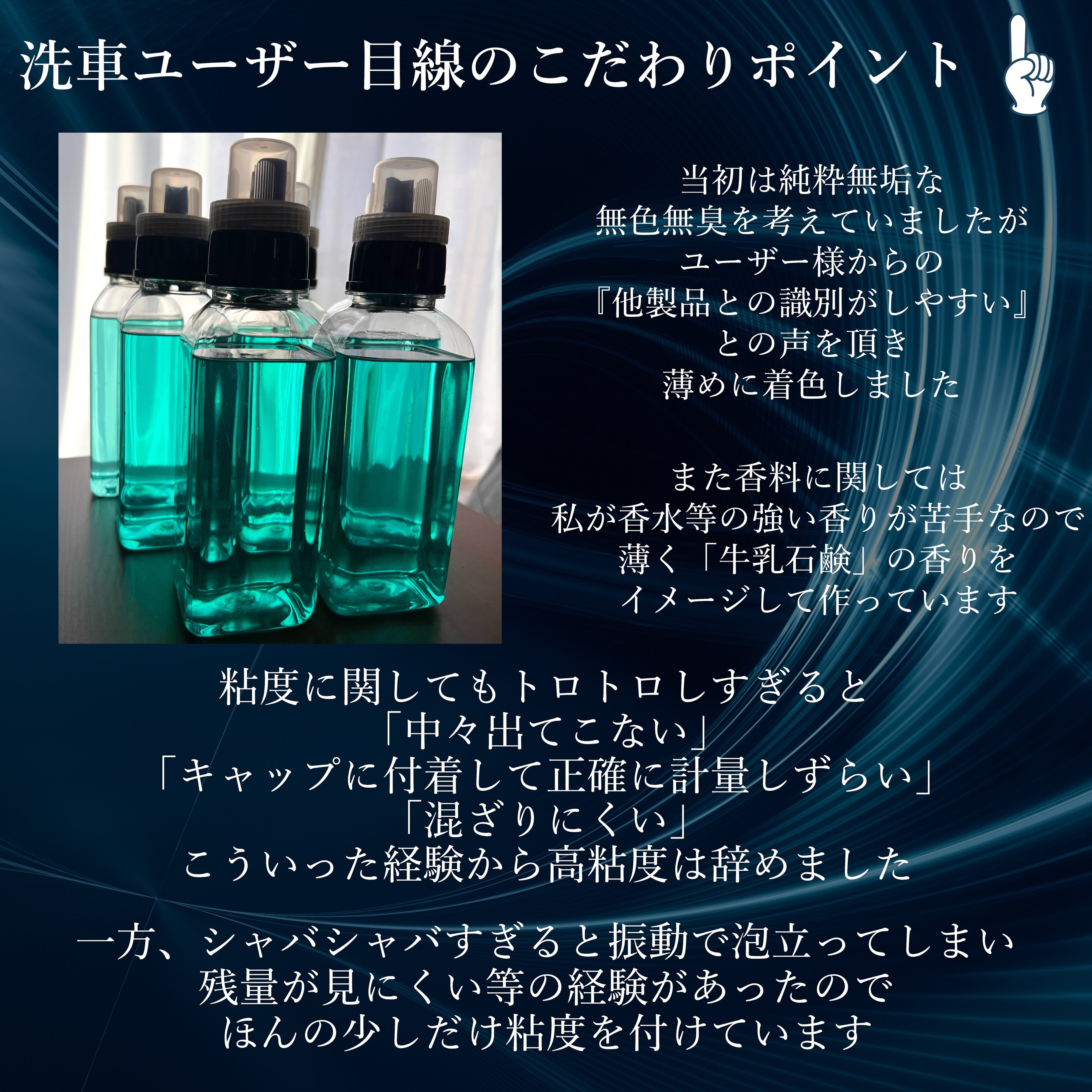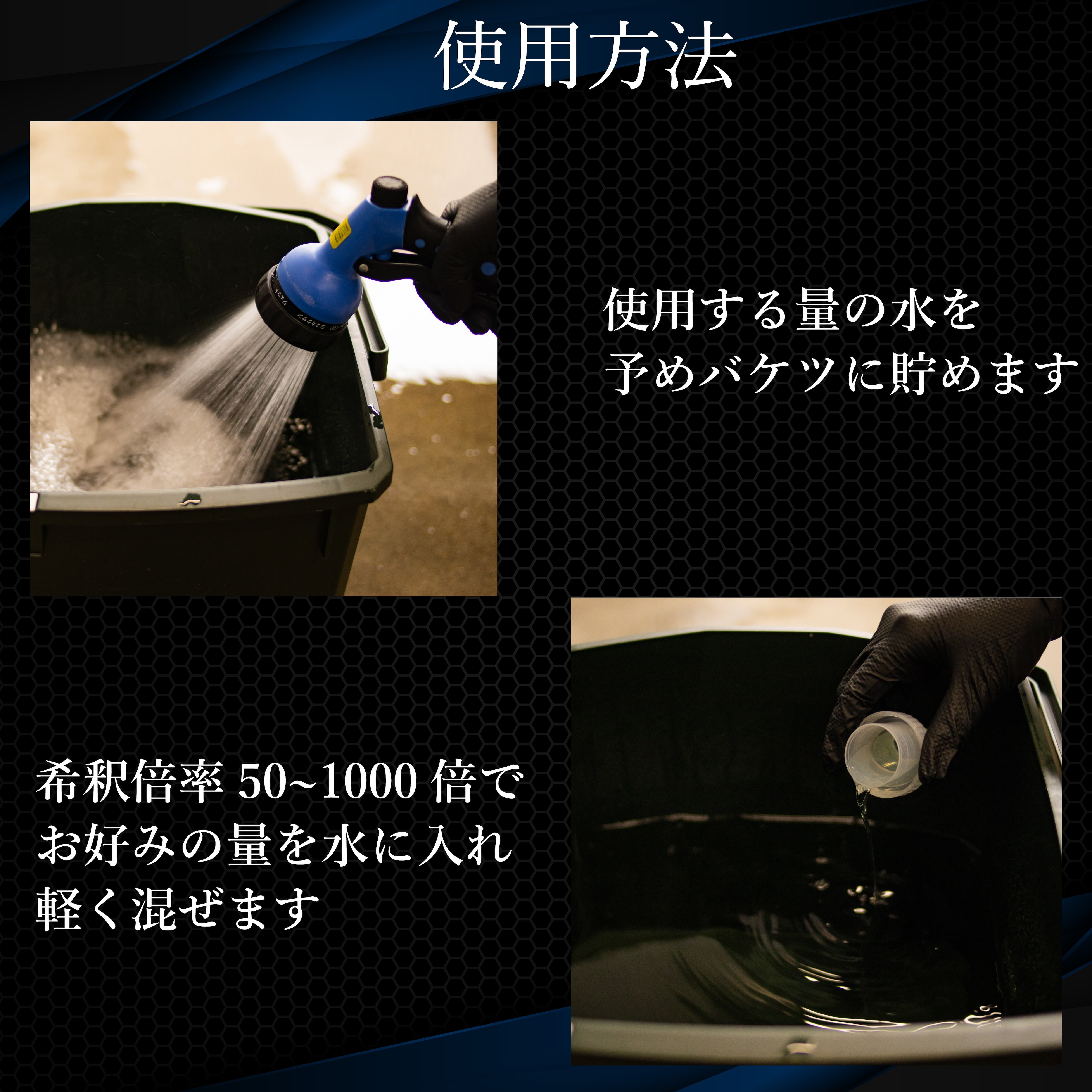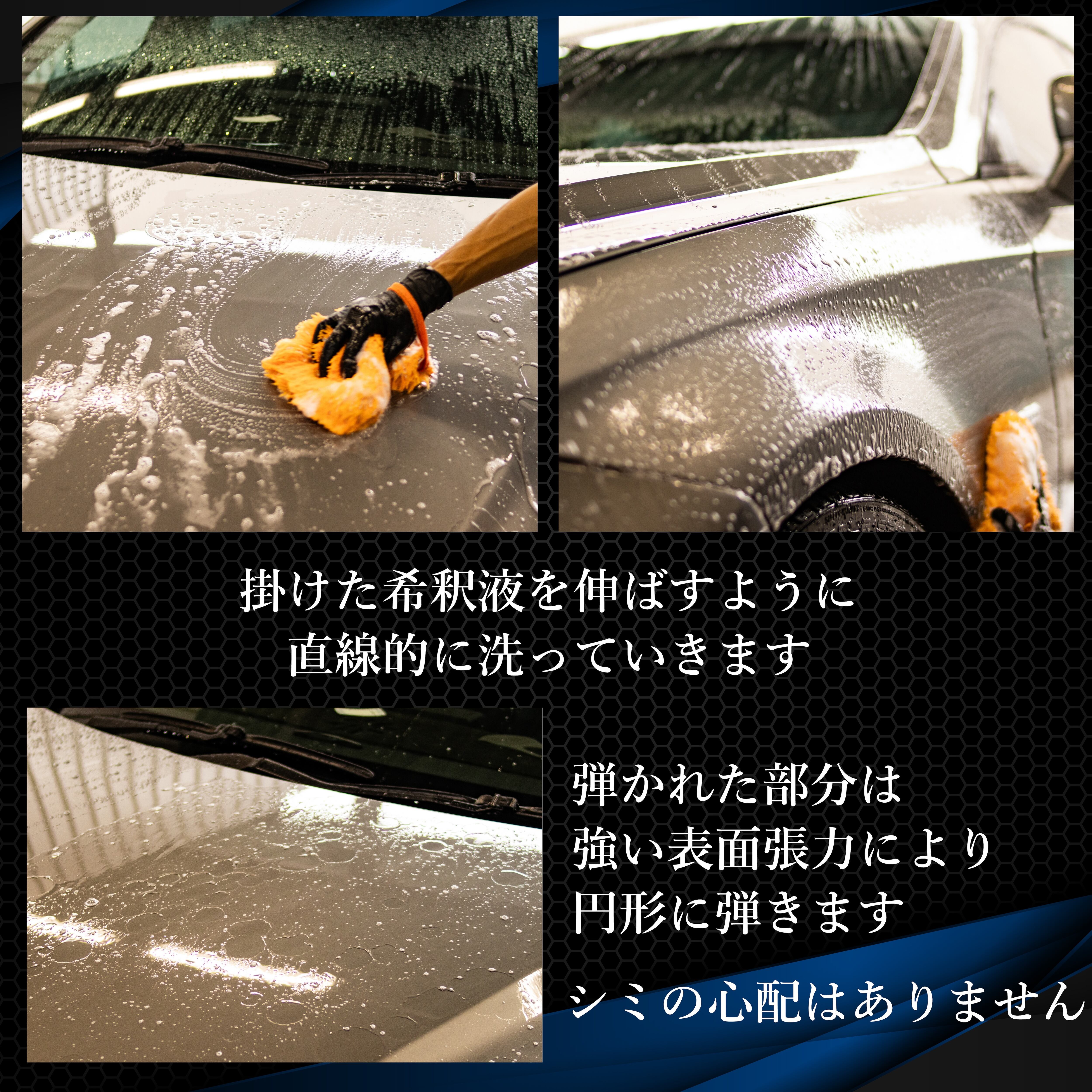 1:1000で十分な洗浄力を発揮しますが、高希釈比率1:100程での使用がオススメで、希釈を上げていく事で高撥水ボディーにも弾かれにくく弾かれた部分も高い表面張力によりシャンプー液同士が引き合い水分を保持し続ける特殊なシャンプーになっています。