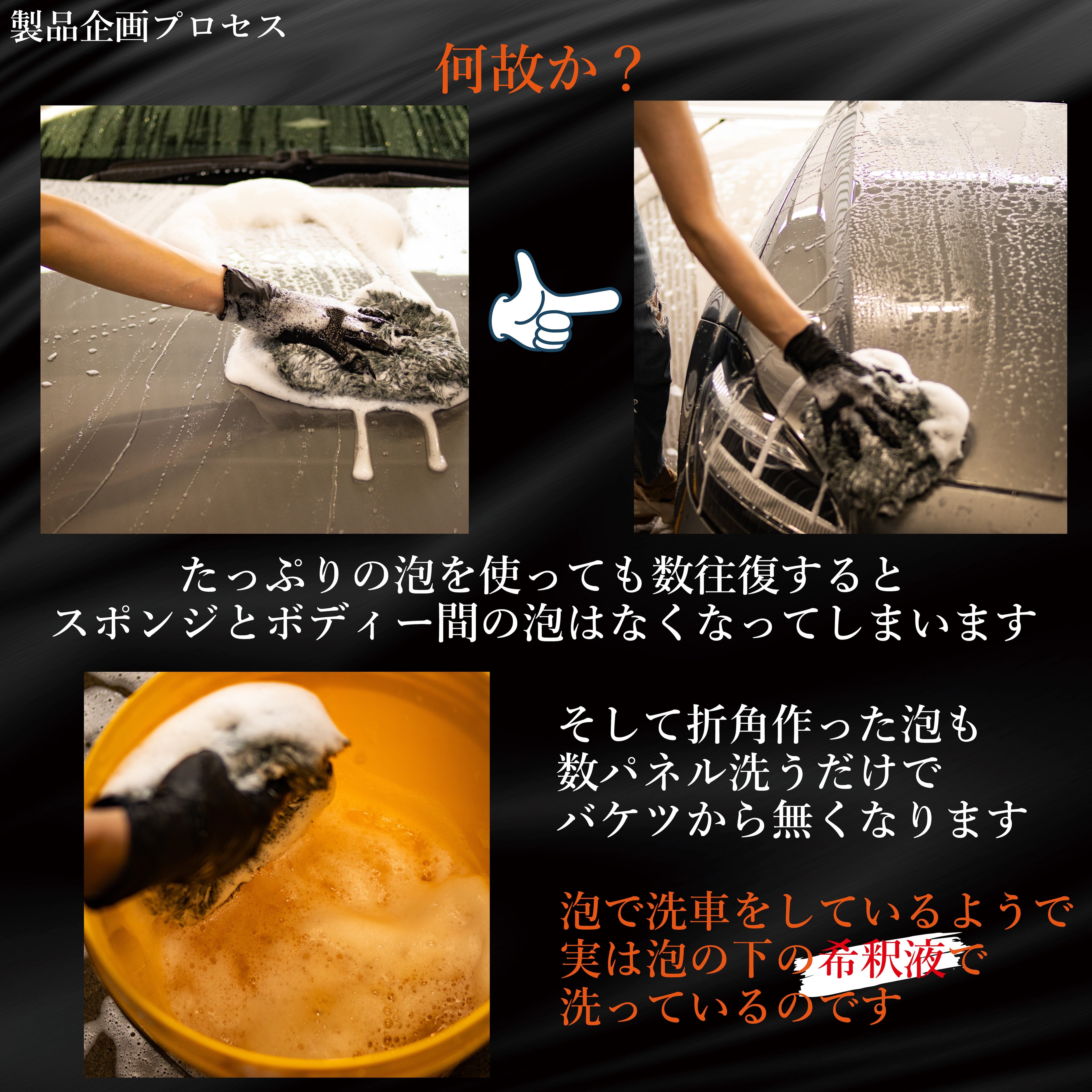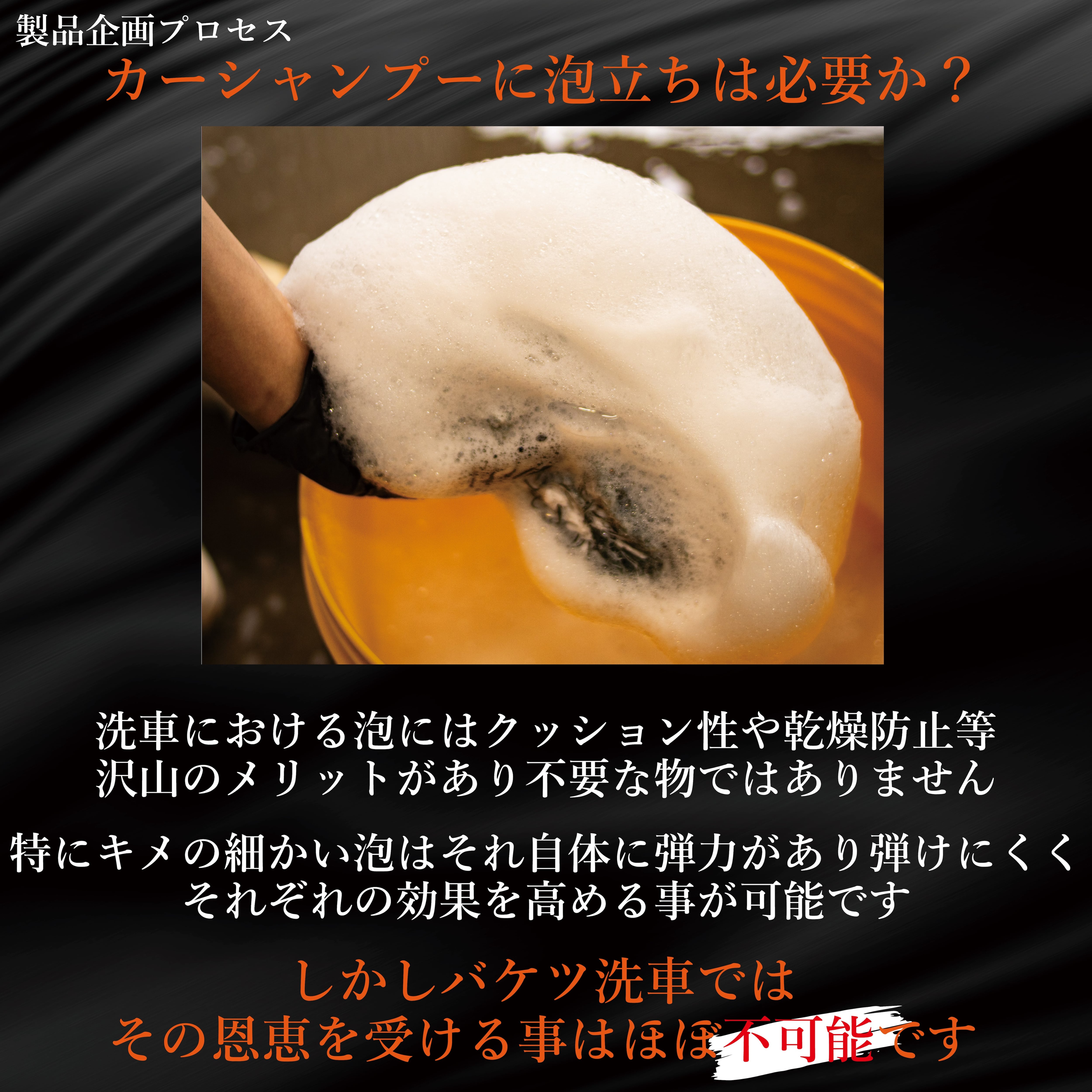 洗車には「泡立ち」が重要という固定概念を打ち壊すべく開発した新感覚カーシャンプーで新たに「泡無し洗車法」を提案します。