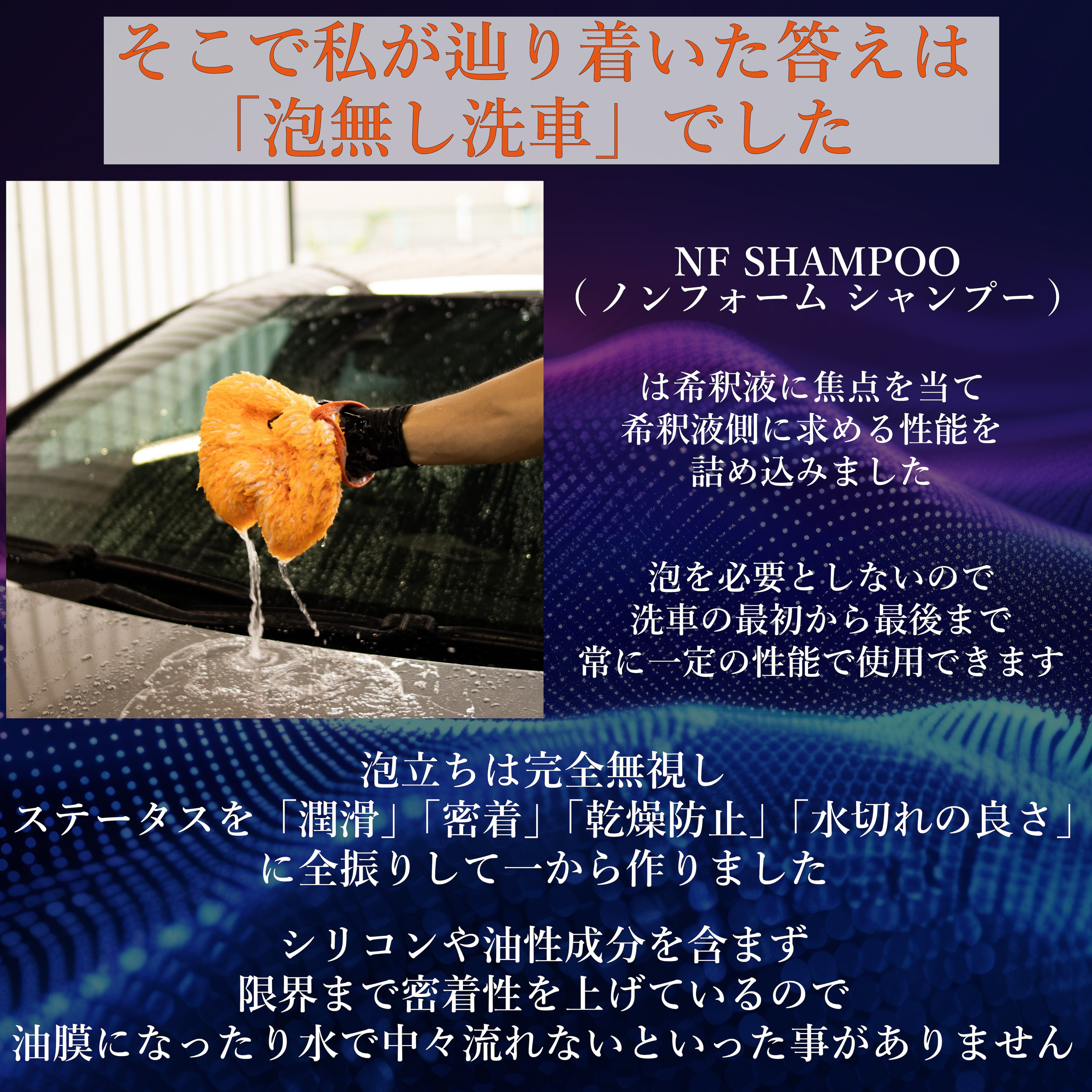 「NF SHAMPOO」は潤滑性と密着性を最重要視した乾燥防止型の中性カーシャンプーです。